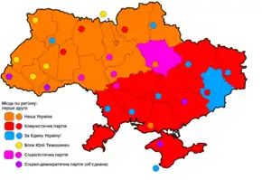 In this election, parallel voting was used. Half of the deputies to Verkhovna Rada (parliament of Ukraine) were elected on proportional basis, while the other half were elected by popular vote in single-mandate constituencies.[3] In order to gain any (proportional) seats in Verkhovna Rada a party needed to receive at least 4% of the popular vote.[4]