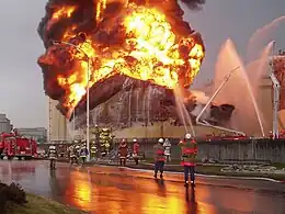 Several sea ports in the area sustained moderate damage such as cracks and wall collapse due to lateral ground spreading caused by liquefaction. Some 123 coastal fishing ports and facilities in eastern Hokkaidō reported significant damage, with an additional 25 ports damaged in Iwate.[4] At least three major ports were affected by the disaster; Kushiro Port sustained great damage to one of its piers as a result of ground displacement and sand boils.[14] Tsunami waves stranded several small boats onshore; various ship containers and oil tanks along coastlines sustained damage. The earthquake left marine oil spills in its wake, though the conditions were quickly normalized.[15]