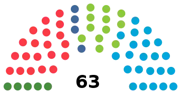 There are six constituencies in Iceland. According to the Law on Parliamentary Elections (nr.24/2000), each constituency is allocated nine seats decided by proportional voting in the constituency. In addition there are nine leveling seats (either 1 or 2 per constituency, depending on their population size) which are allocated with the aim of achieving proportionality based on the overall number of party votes at the national level. The number of constituency seats shall however be adjusted ahead of the next election, if the ratio of residents with suffrage per available seat in the constituency becomes more than twice as big in the latest election, comparing the constituency with the highest ratio against that with the lowest ratio. In that case a constituency seat is reallocated from the constituency with the lowest ratio to that with the highest, until the various ratios comply with the rule. However, the total number of seats (including leveling seats) must never become less than six in any constituency.[5] The box below displays the number of available seats in each constituency at the 2003 parliamentary election.[6]