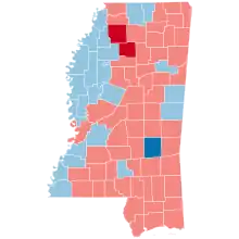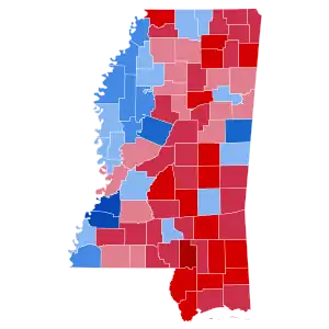 Mississippi is one of the most racially polarized states in presidential elections. Black Mississippians almost uniformly vote Democratic, while white Mississippians vote Republican nearly as consistently. In 2004, 14% of white Mississippians voted for John Kerry and 10% of African Americans voted for Bush.[7] Kerry's main support lay in the western counties on the Delta and next to the Mississippi River.