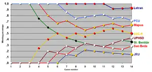 3 PCU school colors PCU Baby Dolphins 7 5 .583[lower-alpha 1] 4 Twice-to-win in the semifinals