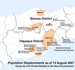 On 10 August, a convent in Baucau was attacked and damaged, and a number of female students at the convent were said to have been raped. The government said that a child had been killed in Viqueque, the first death to be reported in the unrest.[41] On 11 August, a UN convoy of three vehicles was attacked between Baucau and Viqueque. According to Fretilin, this attack was the result of the destruction by members of the UN force of banners and flags used by protesters.[42]