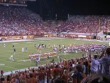 The Longhorns played games against two opponents they had never faced previously: Arkansas State University and the University of Central Florida (UCF).[8] The Longhorns narrowly achieved a victory in their home opener with Arkansas State,[9][10][11] and in their first road game of the season, Texas was the inaugural opponent for the UCF Knights in their new stadium.[12] In preseason speculation, games against Texas Christian University (TCU) and Oklahoma (OU) were considered among the top 20 games to watch during the 2007 college football season.[13]