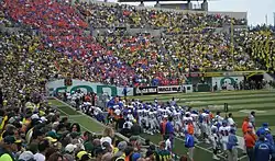 Since joining D1A (now FBS) in 1996, Boise State had lost all 13 of their road games against teams from BCS conferences. That streak ended with a 37-32 win over Oregon of the Pac-10 in front of 58,713 hostile fans in Autzen Stadium. The Broncos held leads of 24-6 at halftime and 37-13 in the 4th before Oregon closed out the game with 19 unanswered points. The Broncos were held to only 38 yards rushing, but were helped by the arm of Freshman quarterback Kellen Moore. Moore went 25-37 for 386 yards, 3 touchdowns and 1 interception. One touchdown pass went for 73 yards to Senior Vinny Perretta, his first TD of the season, before he left the game with a concussion. Junior Jeremy Childs added 4 receptions for 100 yards with a long of 41. Junior Kyle Wilson made 2 interceptions (totaling 3 on the season) while Sophomore Brandyn Thompson made his first career interception. Sophomore kicker Kyle Brotzman went 3-4 on field goals from 24, 36, and a career long 51 yards. Sophomore safety Jeron Johnson was ejected late in the 4th. The win propelled the Broncos into the top 25 in both major polls for the first time this season, being ranked 19th by the AP and 20th by the coaches in the USA Today poll. For his efforts, Kellen Moore was named the Walter Camp Football Foundation Bowl Subdivision National Offensive Player of the Week and the WAC Offensive Player of the Week. The Broncos were also named the Tostitos Fiesta Bowl National Team of the Week.