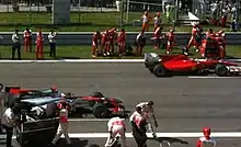 Button made his pit stop on lap 36, and by staying out for one lap longer Alonso rejoined ahead of Button after his stop, although his teammate Massa actually held 1st for two laps before his own pit-stop relegated him back to 3rd. It was very tight as Alonso exited the pits, but the Spaniard just managed to stay ahead by holding the racing line as the two were side by side through turns one and two. Jarno Trulli was the race's next retirement in the Lotus with a gearbox failure on lap 46.
