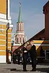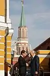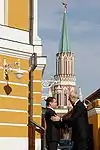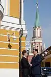 At 10:00 am (MSK), the clock of Spasskaya Tower in the Moscow Kremlin rang and signalled the beginning of the parade commemorating the defeat of Nazi Germany by the Union of Soviet Socialist Republics in the Great Patriotic War. The event then began with the display of the flag of Russia and the Victory Banner. After this, commander of the Moscow Military District Colonel General Valery Gerasimov, who commanded the parade, and Anatoly Serdyukov, the Russian Minister of Defence, who inspected the parade, joined and inspected the troops. At 10:14 am, Serdyukov reported to Supreme Commander-in-Chief, and Russian President, Dmitry Medvedev on the readiness of the troops.[18]