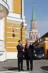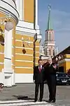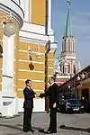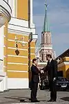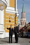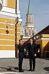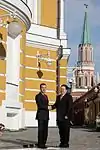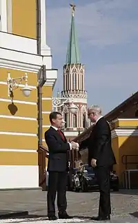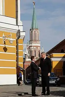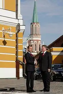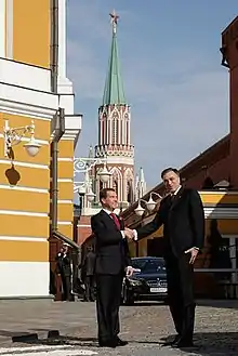 Chinese President Hu Jintao confirmed his attendance at the parade on 3 May. The following day Slovak President Ivan Gašparovič's attendance was confirmed.[7] Other world leaders who confirmed their attendance included Czech President Václav Klaus,[8] French President Nicolas Sarkozy,[8] Italian Prime Minister Silvio Berlusconi,[8] Serbian President Boris Tadić,[9] Bulgarian President Georgi Parvanov,[10] and Vietnamese President Nguyễn Minh Triết,[11] Leaders from Armenia, Azerbaijan, Estonia, Greece, Israel, Kazakhstan, Latvia, Mongolia and Slovenia also confirmed their attendance.[9] On 8 May Sarkozy and Berlusconi announced that they wouldn't be attending the parade in Moscow, so that they could tackle the European sovereign debt crisis.[12][13]