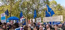 May triggered Article 50 of the Treaty on European Union to leave the EU in March 2017.[25][26] However, under her leadership, the government was unable to reach an EU withdrawal agreement approved by the Conservative Party as a whole. How to manage the border between Northern Ireland and the Republic of Ireland was a major problem; the so-called 'backstop'.[27]
