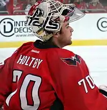 Hershey went 0-for-9 in the power play in their subsequent 1–0 loss to Springfield on December 22, which ended a seven-game point streak for Taffe.[41] Holtby's 2–0 shutout against Scranton on December 26 brought his record to 12–9–1, tying him for third in the league for wins; his four shutouts of the season tied him for second in the league.[37] During a five-game span he stopped 154 of 158 shots, a .975 save percentage.[37] With their sixth straight road win on December 27 against Wilkes-Barre/Scranton, Hershey saw a streak of 21 straight successful penalty kills end with a power play goal by the Penguins' Paul Thompson.[22] Hershey lost their next three games, during which they went 0-for-11 on the power play.[42] Although his shutout streak ended, Holtby made 89 combined saves during the losing streak.[43][44][45] He was named AHL Goaltender of the Month for December, during which he had a .943 save percentage and allowed one goal or fewer in six of 10 starts.[46]