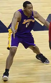 With Nash still out, D'Antoni started 2–3 as a Laker, a minimal improvement over Brown's 1–4 start.[54] The team had been struggling to get the big men Gasol and Howard involved in the new offense.[55] Bryant was also adjusting, running more screen-rolls and fewer post ups than at any time in his career.[56] Additionally, backup point guard Steve Blake had been out since an abdominal injury on November 11, and he would not return until late January.[57] On November 30, the Lakers made 17 three-point field goals—tying a team record for a regulation game—in a 122–103 win over the Denver Nuggets. Free agent acquisition Antawn Jamison scored 33 points, the first time a Laker had scored 30 points as a reserve since Shaquille O'Neal in 1998. Jamison also made five three-pointers, while Jodie Meeks scored 21 on a career-high seven three-pointers. Howard even added the second three-pointer of his career in addition to his 28 points and 20 rebounds.[58] They lost 113–103 to the Orlando Magic the following home game in Howard's first matchup against his former team. He had 21 points and 15 rebounds, but he was intentionally fouled and shot only 9–for-21 on his free throws.[59]