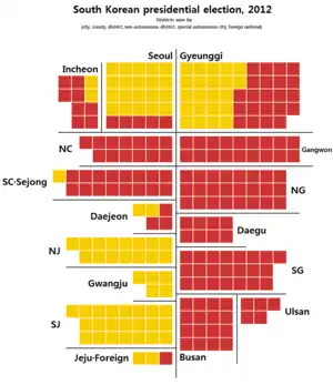 Presidential elections were held in South Korea on 19 December 2012. They were the sixth presidential elections since democratization and the establishment of the Sixth Republic, and were held under a first-past-the-post system, in which there was a single round of voting and the candidate receiving the highest number of votes was elected. Under the South Korean constitution, a president is restricted to a single five-year term in office. The term of the then incumbent president Lee Myung-bak ended on 24 February 2013. According to the Korea Times, 30.7 million people voted with turnout at 75.8%. Park Geun-hye of the Saenuri party was elected the first female South Korean president with 51.6% of the vote opposed to 48.0% for her opponent Moon Jae-in.[1] Park's share of the vote was the highest won by any candidate since the beginning of free and fair direct elections in 1987 and the first such election in which any candidate won a majority.[2] Moreover, as of the 2022 election, this is the latest South Korean presidential election in which the winning candidate won an absolute majority of the vote.
