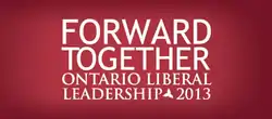 The 2013 Ontario Liberal Party leadership election, held on January 26, 2013, at Maple Leaf Gardens in Toronto,[1] elected Kathleen Wynne as the new leader[2] of the Ontario Liberal Party, replacing Dalton McGuinty, who announced his resignation on October 15, 2012. With the Liberals forming the Ontario government, Wynne consequently became Premier of Ontario. After leading a minority government for 18 months, she called an election after the defeat of her government's budget and she led her party to a renewed majority government in June 2014.