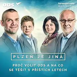 Civic Democratic Party led campaign with slogan "Pilsen is different" with subtitle "We didn't play a theatre, we build it." Party's billboards used blue colour which contrasted with campaign of other parties that used white colour. ODS presented itself by successes of its rule over the city in previous term.[9][10] Campaign of Civic Democrats was awarded by 8 Golden Ballot Awards.[11] Campaign of ODS was manufactured by Adam Hejl, Michal Kupilík and Petr Sokol.[12]