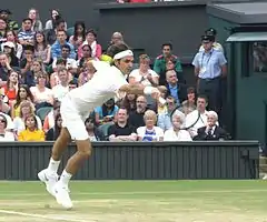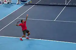 Federer's next contest was the men's singles event of the 2014 Australian Open in Melbourne. His appearance at the 2014 Australian Open marked a record-breaking 57 straight Grand Slam appearances. He finished in the semifinals last year, losing to Andy Murray in five sets. Federer was the sixth seed in the tournament, and began his tournament by playing Australian wildcard James Duckworth in the first round, breaking him four times en route to a straight-sets win.[4] He then played Blaž Kavčič of Slovenia in the second round. Federer swept through the first two sets, but errors in the third set allowed Kavčič to force a tiebreak, which Federer won to close out the match. Federer broke him six times in total and won seven of the last eight points in the tiebreak to win his seventieth match in Melbourne.[5] Federer played Teymuraz Gabashvili of Russia in the third round for the first time in six years. He saved five break points and broke Gabashvili's serve five times en route to a straight-sets victory.[6] Federer played Jo-Wilfried Tsonga of France in the fourth round, and won in straight sets. Federer found breaks in each set, including one at the beginning of the first set, and dictated at the net, using aggressive play to keep Tsonga at bay. With his win, Federer reached his eleventh consecutive Australian Open quarterfinal, and has now reached 41 Grand Slam quarterfinals, tying the all-time record held by Jimmy Connors. Federer faced Andy Murray in the quarter-finals and defeated him in four sets after missing several break opportunities and squandering two match points in the third set tiebreak. Federer lost to Rafael Nadal in the semifinals, in straight sets.[7]