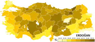 The election was criticised by both the political opposition and international observers for alleged media bias in favour of Recep Tayyip Erdoğan, corruption allegations, the inaccuracy of opinion polls and the misuse of official public resources during Erdoğan's campaign.[7][8][9][10] While praising the authorities for safeguarding the right to assembly as well as the peaceful electoral conduct, the Organization for Security and Co-operation in Europe (OSCE) voiced concerns over the unequal distribution of campaign resources and media intimidation.[11][12] The historic 12-year low turnout of 74.13%, attributed to the fact that the election was held in summer while many citizens were on holiday, was seen by many politicians such as MHP leader Devlet Bahçeli as a significant factor in affecting the outcome.[13][14][15] The election loss for the opposition CHP resulted in its leader Kemal Kılıçdaroğlu taking the decision to hold a party convention with a leadership election in response to growing dissatisfaction against his electoral performance.[16][17]