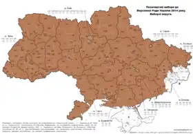 Snap parliamentary elections were held in Ukraine on 26 October 2014 to elect members of the Verkhovna Rada. President Petro Poroshenko had pressed for early parliamentary elections since his victory in the presidential elections in May.[1] The July breakup of the ruling coalition gave him the right to dissolve the parliament, so on 25 August 2014 he announced the early election.[2]