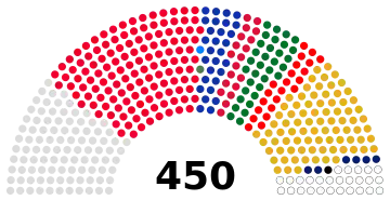 The Verkhovna Rada has 450 members, elected to a five-year term in parallel voting, with 225 members elected in single-member constituencies using FPTP system and 225 members elected by proportional representation (closed list) in a single nationwide constituency using the largest remainder method with 5% threshold.[17] Parties are not allowed to form electoral blocs (in contrast to 1998-2007 elections). Attempts to return to proportional representation with open party lists and electoral blocs were failed.[18]