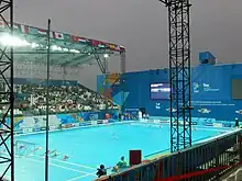 This was the first time since the 1908 Summer Olympics that 100m swimming pools were placed in a football stadium. On the football pitch of the stadium two temporary 50 meters long pools are constructed. Main pool for swimming and synchronised swimming competitions, and a temporary training pool connected with the competition pool with additional athletes relax and massage area.
