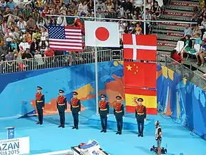 The 16th FINA World Championships (Russian: Чемпионат мира по водным видам спорта 2015), also Aquatics 2015, were held in Kazan, Russia from 24 July to 9 August 2015. Russia hosted this event for the first time. The number of participating national teams (190), athletes (2,400) and the number of medals (75) were the most ever amongst these championships.[1][2] This was the first time the World Aquatics Championships partially overlaps with the FINA World Masters Championships that have a number of athletes (near 5,500), countries (110) and medals (635) which are the most ever also.