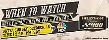 - "2015 Hollywood Casino 400". Sprint Cup Series. Season 67. Kansas City, Kansas. October 18, 2015. Event occurs at 2:34 p.m. NBC Sports. NBC. Retrieved October 26, 2015.
