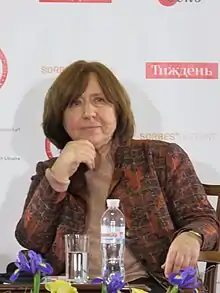 The 2015 Nobel Prize in Literature was awarded to the Belarusian journalist Svetlana Alexievich (born 1948) "for her polyphonic writings, a monument to suffering and courage in our time".[1][2] She described as the first journalist and the first Belerusian national to receive the Nobel prize since December 10, 2015.[3]