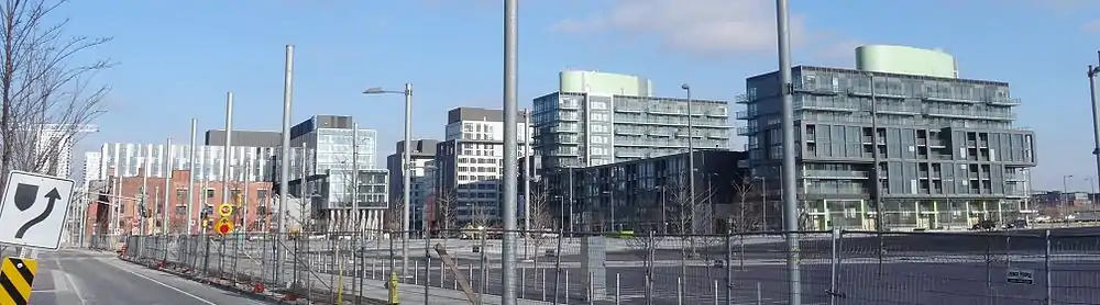 The Athlete's village cost $735 million CAD and had the capacity to hold up to 7,200 athletes and officials.[27] After the games, the village was converted to 746 market-priced condos, 41 market-priced town homes, 250 affordable-rent apartments, 257 student dormitory units for George Brown College, office and retail units, and a YMCA recreation centre. The Athlete's Village was located in the West Don Lands along Front Street between Bayview Avenue and Cherry Street in Toronto. The development was certified LEED Gold.[28] Five satellite villages (all hotels and university residences) were also used to house athletes that were competing in venues far from the main village.[27]