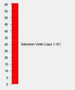 Before the formation lap, Rosberg appeared to have an issue with his car, when he stopped at the end of pit lane on the way to the start grid. However, his mechanics were able to rectify the problem, described by Niki Lauda as "a glitch", and he made it to the grid.[32] With everyone starting on the super-soft tyre compound, a race with two pit stops was expected for most drivers.[32] At the start, all drivers at the front of the field held their positions, while further back, Nico Hülkenberg, who had a good start, and Sergio Pérez nearly collided while fighting for position.[33] Max Verstappen's Toro Rosso STR10 stalled on the grid and was pushed back to the pit lane, only to start his race shortly after, more than one lap down on the leaders.[32] Vettel was able to build a gap to Ricciardo behind him quickly, leading the Red Bull by three seconds after the first lap. Fernando Alonso, who had enjoyed a decent start to move up into eleventh, came under pressure from Sainz by lap four, followed by Grosjean, who lost places at the start because he had to move around the stationary Verstappen. While Vettel's lead was about five seconds on lap five, Verstappen unlapped himself by lap six and posted fast lap times.[32] Meanwhile, Nico Rosberg held off the two Williams cars of Bottas and Massa, while Lewis Hamilton in front was able to move clear of the pack fighting for sixth place.[33] Kimi Räikkönen in third place was held at a distance by Ricciardo, trailing him by 1.6 seconds on lap nine. A lap later, Grosjean became the first driver to pit. More cars came in on lap eleven, leading to heavy traffic that prevented Sainz and Alonso from leaving their pit boxes, costing time. Alonso emerged from pit lane ahead of Grosjean, who moved past him into thirteenth. Felipe Massa had a slow stop of 4.8 seconds when he made a pit stop at the end of lap 13. When he emerged from pit lane, Nico Hülkenberg was approaching on the racing line. Both drivers collided, with Hülkenberg being catapulted off Massa's front right tyre, causing him to retire from the race.[32][34] A Virtual Safety Car period ensued, that saw all drivers pit that had not done so before. Since Kvyat had made a pit stop shortly before the safety car was deployed, both Mercedes cars were able to move in front of him, leaving Kvyat in sixth place. Jenson Button's stop took a long time, dropping him to 16th place. By lap 16, the virtual was replaced by the actual safety car, which stayed out until the end of lap 18.[32]