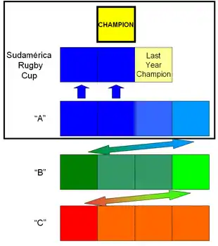Structure of the South America rugby union competition, in four levels with 13 countries.