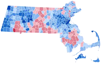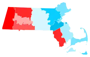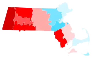 Clinton improved on Obama's 2012 performance by around 4%, due to a large swing to the Democrat in the metropolitan Boston area, making the state one of 11 (along with the District of Columbia) that shifted towards the Democrats. Meanwhile, the New Bedford and Fall River areas and the western part of Massachusetts, particularly eastern Berkshire County, swung to Trump.[2] Trump became the first Republican since Dwight D. Eisenhower in 1956 to win the town of Ware.