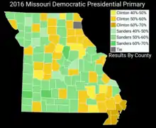 The Missouri primary ran on March 15, 2016, alongside those of the Republican, Democratic, and Constitution parties. 40% of the electorate voted to stand uncommitted to any candidate. Austin Petersen, running in his home state, finished second, with 29% of the statewide vote, which was double that of Steve Kerbel from Colorado, who finished third, with 14%. Petersen comfortably won the support of voters in the state's capital, Jefferson City, and its surrounding counties, but was fell heavily behind the uncommitted vote in the state's two largest cities, Kansas City and St. Louis. Kerbel won three counties around Springfield, while Marc Allan Feldman, Cecil Ince, and Rhett Smith all won a sprawl of counties across the state; in most of these counties, however, only a single vote was cast. No votes were cast for Libertarian Party candidates in the northwestern counties of Harrison, Holt, Mercer, and Worth.[5]