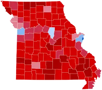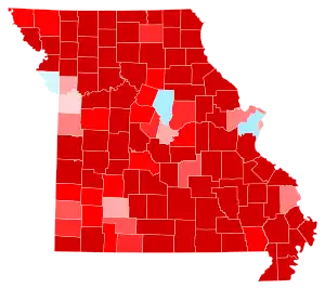 Trump carried the state with 56.4% of the vote, while Clinton received 37.9%.[3] Trump's 18.5-point margin of victory in the state was almost double that of Mitt Romney's from 2012. Clinton carried only four jurisdictions: Boone County, home to Columbia and the University of Missouri; Jackson County, which includes most of Kansas City; St. Louis County; and St. Louis City. Clinton's vote share percentage was the lowest a Democratic presidential nominee obtained in the state since George McGovern's 37.7% in 1972, further cementing the state's drift towards the Republican Party and away from its long-held status as a bellwether state. Missouri was also one of eleven states that voted for Bill Clinton in 1992 and 1996 but were lost by Hillary Clinton in 2016. Additionally, this was the first time since 1984 that Missouri voted by double digits for the Republican candidate, and the first time since 1992 that the state voted by double digits for either candidate. As of 2020, this is the largest loss by a Democrat since Democratic nominee Walter Mondale in 1984.