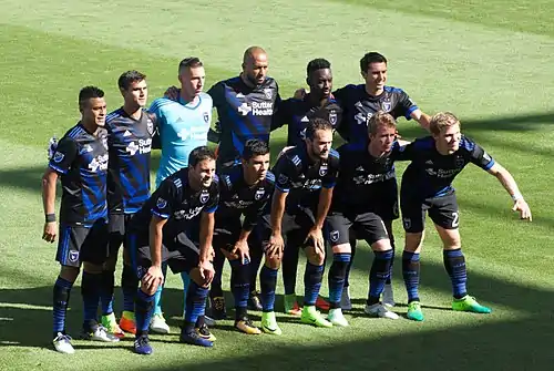 San Jose lining up to play the Colorado Rapids on July 29, 2017. From left to right, top row: Darwin Cerén, Chris Wondolowski, David Bingham, Víctor Bernárdez, Simon Dawkins, and Shea Salinas. Bottom row: Andrés Imperiale, Nick Lima, Marco Ureña, Jackson Yueill, and Florian Jungwirth.