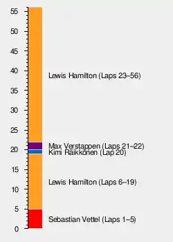 Lewis Hamilton won after passing title rival Sebastian Vettel early on in the race with the German driver coming home second, Hamilton extended his Championship lead in the process to 66 points. Kimi Räikkönen was third, Max Verstappen did overtake Räikkönen on the final lap, although Verstappen was found to have cut the corner, resulting in a time penalty.[14]