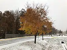 An early season winter storm developed in a deep dive of the jet stream into the mid-south on November 13. In Monroe, Louisiana 0.4 inches (1.0 cm) of snow accumulated on the morning of November 14, breaking the record for the earliest snowfall by 10 days. In Mississippi light snow was reported in Greenville, sleet in Tupelo and Memphis, Tennessee picked up 0.6 inches (1.5 cm) of snow. Meanwhile, in Ohio, ice accumulations of one-quarter to one-third of an inch were reported in Cincinnati and Dayton metros as well as parts of Northern and Central Kentucky. A general 2 to 5 inches (5 to 13 centimetres) of snow fell in the St. Louis metro with isolated reports of 9 inches (23 cm).[5] On November 15, as the storm headed northeastward, an unexpected 6.4 inches (~16.2 cm) of snow fell in Central Park, which became their earliest six inch snowfall on record,[6] as well as their second largest November winter storm on record,[7] which caught many off guard and resulting in several hour-long commutes that night.[5] This was considered by some as one of New York City's worst commutes, as some were over ten hours, and New Jersey reported 555 car crashes.[8][9] Further north, the Toronto area received 10–15 cm (4–6 in) of snow, leading to significant delays. In New Jersey, a person died due to the storm in a traffic related incident.[10] Two others died, and 44 were injured, when a bus was overturned in Mississippi.[11] Eight others died, including three in Arkansas, two in Michigan, and one each in Maryland, Ohio and Indiana.[12] In addition, around 190,000 customers lost power as the storm moved through.[6] The melted snow from this storm made 2018 the wettest year on record in Baltimore.[13] The colder air that helped make the snow more intense then originally forecasted also led to daily record lows in Massena, New York, Montpelier, Vermont, Caribou, Maine and Bangor, Maine.[14]