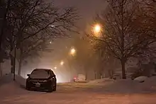 Another storm began on February 11, with some areas in the Midwestern and Northeastern United States expected to receive up to 12 inches (30 cm) of snow in the upcoming days, as well as parts of Ontario and Quebec expected to receive 14 inches (36 cm).[36] In Toronto, all schools were closed on February 12 in anticipation of the storm.[37] The city saw up to 15 cm (6 in) of snow followed by sleet and freezing rain. Ice and snow in Chicago resulted in 70,000 ComEd power outages.[38] The storm's maximum snowfall accumulation was 26.5 inches (67 cm), which fell near Negaunee, Michigan. Ice secretion peaked at half an inch north of Toledo, Ohio.[39]