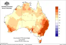 The NSW statutory Bush Fire Danger Period normally begins on 1 October and continues through until 31 March.[112] In 2019–20, the fire season started early with drought affecting 95 percent of the state and persistent dry and warm conditions across the state.[113] Twelve local government areas started the Bush Fire Danger Period two months early, on 1 August 2019,[114] and nine more started on 17 August 2019.[113][115] In the week preceding 10 February 2020, a wide band of heavy rain swept through most of coastal New South Wales, extinguishing a significant number of fires; it left 33 active fires, of which five were uncontrolled, all located in the Bega Valley and Snowy Mountains regions.[89][116] Between July 2019 and 13 February 2020, the NSW Rural Fire Service reported that 11,264 bush or grass fires burnt 5.4 million hectares (13 million acres), destroyed 2,439 homes, and approximately 24 megalitres (5.3 million imperial gallons; 6.3 million US gallons) of fire retardant was used.[117]