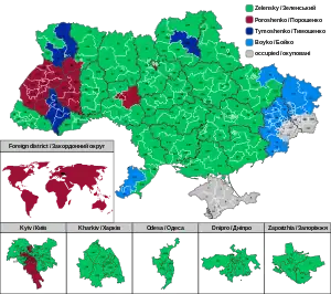 Presidential elections were held in Ukraine on 31 March 2019. As none of the 39 candidates on the ballot received an absolute majority of the initial vote, a runoff was held on 21 April between the top two vote-getters, Volodymyr Zelenskyy, a television personality, and the incumbent president, Petro Poroshenko. According to the Central Election Commission (CEC), Zelenskyy won the second round with 73.22% of the votes.[1][2][3] The election was recognized as free and fair.[4]