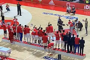 On 6 February, it was reported that 10 players were infected with COVID-19.[12] Reportedly, guards Corey Walden, Quino Colom, Langston Hall, and center Landry Nnoko as well as coaching staff members Nikola Birač, Saša Kosović, and Aleksandar Lukman were infected with the virus.[13] On 9 February, head coach Radonjić announced the Zvezda squad for the Radivoj Korać Cup, adding Crvena zvezda U19 players Nikola Šaranović i Milutin Vujičić to the roster.[14][15] On 10 February, it was reported that one more player was infected with COVID-19.[16] Later that day, it was announced that the infected player is center Duop Reath.[17] Instead of Reath, the club added center O'Bryant to the squad for Radivoj Korać Cup.[18] The Zvezda won its 7th Cup title (10th overall) following a 73–60 win over Mega Soccerbet in the final.[19]