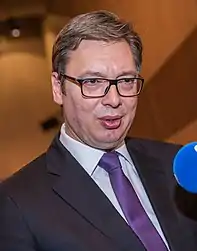 Since Aleksandar Vučić came to power in 2012, Serbia has suffered from democratic backsliding into authoritarianism, followed by a decline in media freedom and civil liberties.[5][6] In the 2016 parliamentary election, the ruling Serbian Progressive Party-led coalition and the Socialist Party of Serbia-led coalition returned to power, and the incumbent prime minister Vučić was successfully re-elected.[7] However, in the 2017 presidential election, Vučić was elected president, and left the government for his new position.[8] The election result sparked protests around Serbia.[9][10] Thousands of demonstrators accused Vučić of leading the country towards authoritarianism.[11] An OSCE report criticized unbalanced media coverage during the election campaign, use of public resources to support Vučić and reports of pressure on employees of state-affiliated institutions to support Vučić and secure, in a cascade fashion, support from family members and friends.[12] Ana Brnabić was appointed head of government as a non-partisan politician, becoming Serbia's first female and first openly gay prime minister.[13] Two years later, she joined the ruling Serbian Progressive Party.[14]