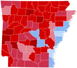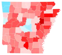 Trump won landslide margins across the state, including in many of the state's metropolitan areas and suburbs. Trump once again carried Woodruff County, formerly a Democratic stronghold, thus marking the first time since its founding that a Democrat was elected president without carrying the county.[7] Biden's strength was mostly isolated to Pulaski County, home to the state capital and largest city of Little Rock, and Jefferson County, home to Pine Bluff. He also won six rural, predominantly African-American counties on the eastern border along the Mississippi River. All but seven counties in the state swung heavily to the right, the exceptions being Pulaski County and one other county in the Little Rock metropolitan area; Sebastian County, home to Fort Smith; and three counties in the northwest encompassing and surrounding the college town of Fayetteville, where the University of Arkansas is located.[8] Notably, Biden lost Washington County, where Fayetteville is, by only 3.9 percentage points, the closest any Democrat has come to winning it since Clinton did so in 1996. Arkansas voted 32.07% more Republican than the national average in 2020.