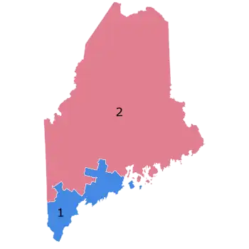 On election day, Biden carried Maine at-large by nine percentage points and the 1st congressional district by 23 percentage points, garnering three electoral votes. However, the rural 2nd district backed Trump by more than seven percentage points, giving him one electoral vote. This was the same result as 2016, and as such marked only the second time since 1828 that Maine split its electoral votes.[3]