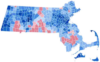 Per exit polls by the Associated Press, Biden's strength in Massachusetts came from college-educated voters, which he won with 74% of the vote, which carries particular weight in Massachusetts, as the state contains the highest proportion of graduates in the country.[32] Trump's slip among suburban white voters led Biden to carry almost every municipality in the Greater Boston area by at least 60% or more, while Trump carried only several towns on the South Shore and in Central Massachusetts. Biden won 301 of the 351 municipalities.[33] Biden swept all demographic groups, garnering 63% of whites, 84% of Latinos, 58% of Catholics, 56% of Protestants, and 86% of Jewish voters. Additionally, Biden won 52% of whites without a college degree within the state, one of Trump's strongest demographics elsewhere in the country.[32] While Biden overwhelmingly carried Latino voters in the state, Trump improved on his 2016 performance in heavily Hispanic cities such as Lawrence, Chelsea, and Holyoke.[34] Trump had the worst vote share in Massachusetts of any Republican nominee since Bob Dole in 1996, and slightly underperformed George W. Bush's 32.5% vote share in 2000.