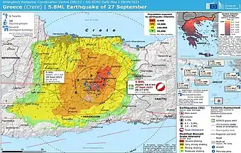 A moment magnitude 6.0 earthquake struck the island of Crete in Greece at a depth of 6 km on 27 September 2021.[4][5][6] The epicenter of the earthquake was located southeast of Heraklion. The quake killed one person, injured 36 (one indirect) and damaged over 5,000 old buildings on the island.[7][8]