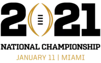 The 2021 College Football Playoff National Championship was a college football bowl game played on January 11, 2021, with kickoff at 8:15 p.m. EST at Hard Rock Stadium in Miami Gardens, Florida and was televised by ESPN. The seventh College Football Playoff National Championship, the game determined a national champion in the National Collegiate Athletic Association's Division I Football Bowl Subdivision (FBS) for the 2020 season. Aside from the all-star games scheduled to follow, it was the culminating game of the 2020–21 bowl season. Sponsored by telecommunications company AT&T, the game was officially known as the 2021 College Football Playoff National Championship presented by AT&T.