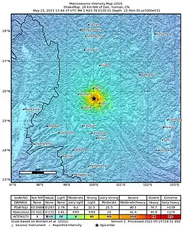 On May 21, 2021, a 6.1 magnitude earthquake struck the Dali City, Yunnan, China, at a depth of 10.0 km.[9] Three people died during the quake, while another 32 were injured.[7][8] The earthquake was referred by the Chinese media as the 5.21 earthquake or 2021 Yangbi earthquake.