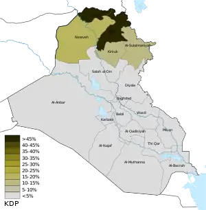 The Kurdistan Democratic Party, which ran independently rather than as part of a multi-party coalition list, won an updated preliminary total of 33 seats, making it Iraq's single largest political party.[24][27]