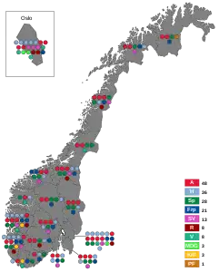 The election was won by a coalition consisting of the social-democratic Labour Party and the agrarian Centre Party that entered into negotiations to form a government.[3][4] The election also resulted in a majority for the parties that seek to dissolve the unpopular and controversial Viken county.[5] Jonas Gahr Støre's Labour Party retained its position as Norway's largest party and expanded their lead in seats over the Conservatives, despite a slight drop in its share of votes and the loss of one seat.[2] Incumbent Conservative Party prime minister Erna Solberg conceded defeat.[6] Her party ended up with the second-largest number of representatives. Støre aimed to form a majority government with the Centre Party and the Socialist Left Party,[7][8] but the latter stated they would remain in opposition citing disagreements over climate and welfare policies,[9] while remaining open for future negotiations and to support the government on common grounds.[10] On 14 October, Støre became prime minister of a minority government, the Støre Cabinet.[11][12]