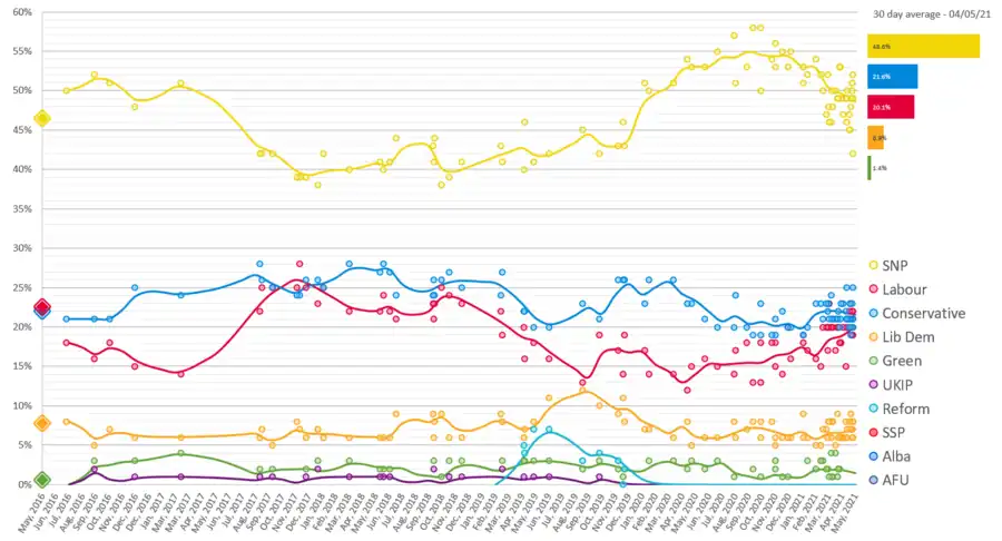 Graph of opinion poll results prior to the 2021 Scottish Parliament election. Trendlines are 30-day moving averages.