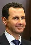 Bashar al-Assad, the 19th President of Syria, took power in a referendum in 2000 following the death of his father Hafez al-Assad, who had ruled Syria for 30 years.[14] Assad also inherited the role of leader of the ruling party: the Regional Secretary of the Syrian Regional Branch of the Arab Socialist Ba'ath Party. He received 97.29% and 97.6% support, respectively, in the uncontested and undemocratic 2000 and 2007 elections.[15][16][17][18][19] On 16 July 2014, Assad was sworn in for another seven-year term after another non-democratic, but this time multi-candidate, election where he received 88.7% of the vote.[20][21][22][23][24][25] The election was held only in areas controlled by the Syrian government during the country's ongoing civil war[26][27] and was criticised by the UN.[28]