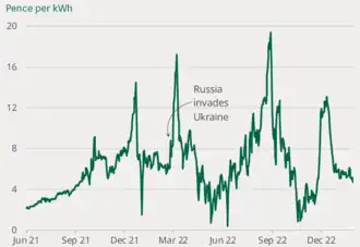 The primary cause of the price rises has been a surge in the wholesale price of natural gas worldwide.[1] Domestic supply only covers about 40% of the United Kingdom's needs,[1] while the rest is imported from neighbouring countries, such as Norway and the Netherlands, and further afield in Qatar and the United States, and Russia supplies around 5% of the UK market.[2][1] Gas prices rose by 250% between January and September 2021, with a 70% rise in the month of August alone.[3] The price increase was caused by a global surge in demand as the world quit the economic recession caused by COVID-19, particularly due to strong energy demand in Asia.[4][5]